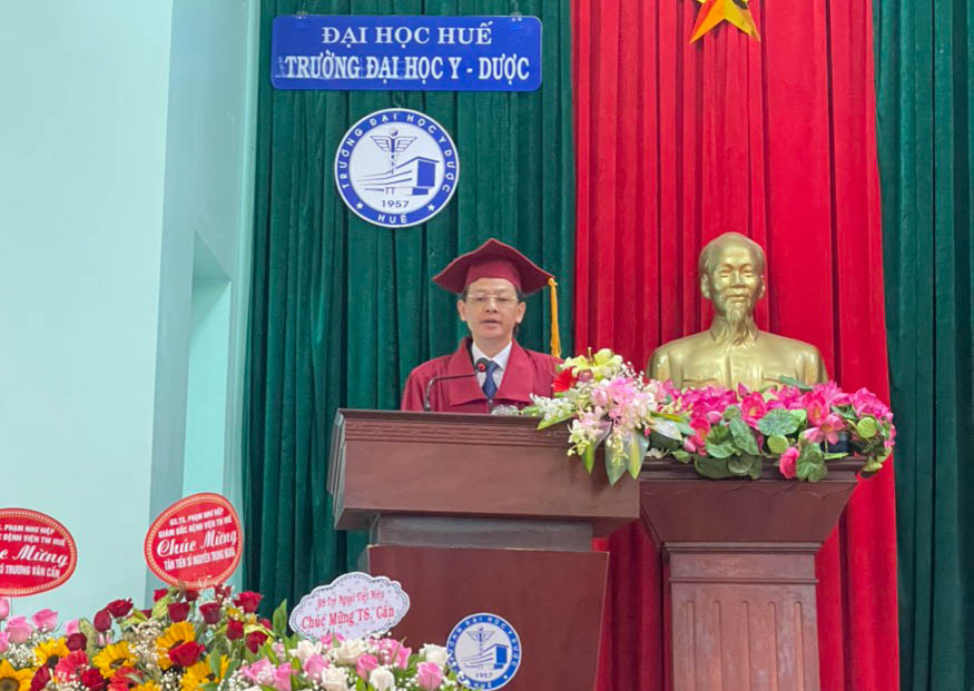 Đại diện cho các tân tiến sĩ, TS Nguyễn Tri Thức, nguyên là NCS bộ môn Nội, đã phát biểu, bày tỏ niềm vui, niềm tự hào khi được học tập và nghiên cứu dưới mái trường Đại học Y - Dược, hứa sẽ đem hết tâm lực, trí lực và kiến thức đã được đúc kết qua quá trình học tập, nghiên cứu từ Nhà trường, vận dụng một cách linh hoạt và sáng tạo vào thực tiễn. Đây cũng là cách để tri ân tới các Thầy Cô và Nhà trường.