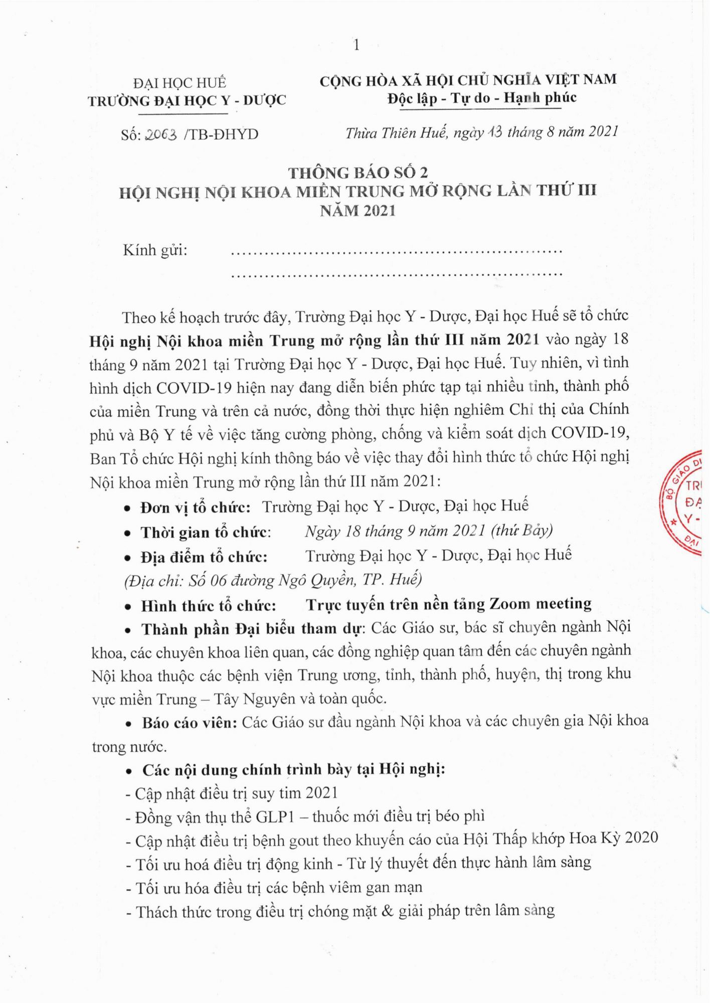 THÔNG BÁO SỐ 2 HỘI NGHỊ NỘI KHOA MIỀN TRUNG MỞ RỘNG LẦN THỨ 3