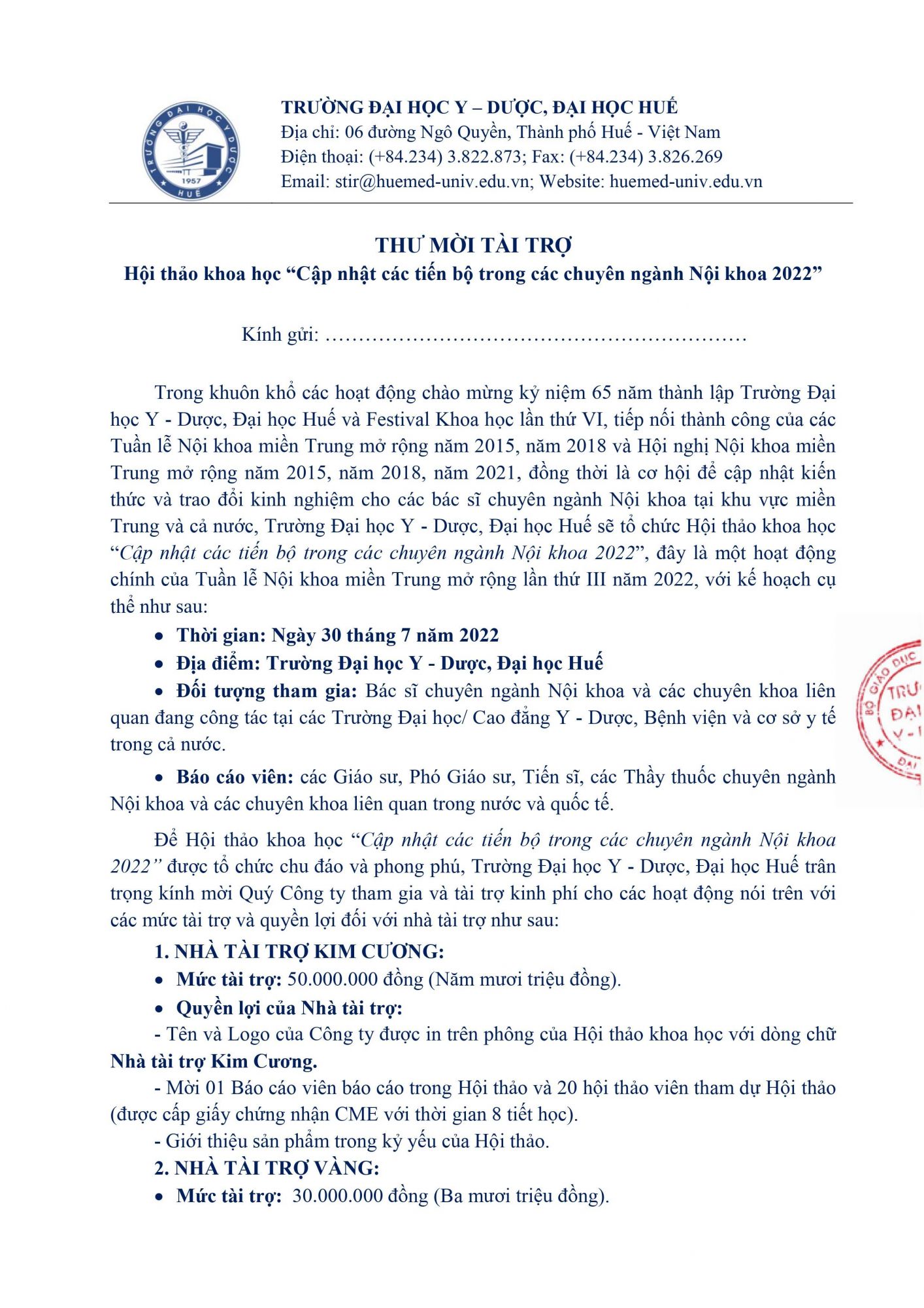 Thư mời tài trợ Hội thảo khoa học “Cập nhật các tiến bộ trong các chuyên ngành Nội khoa 2022”